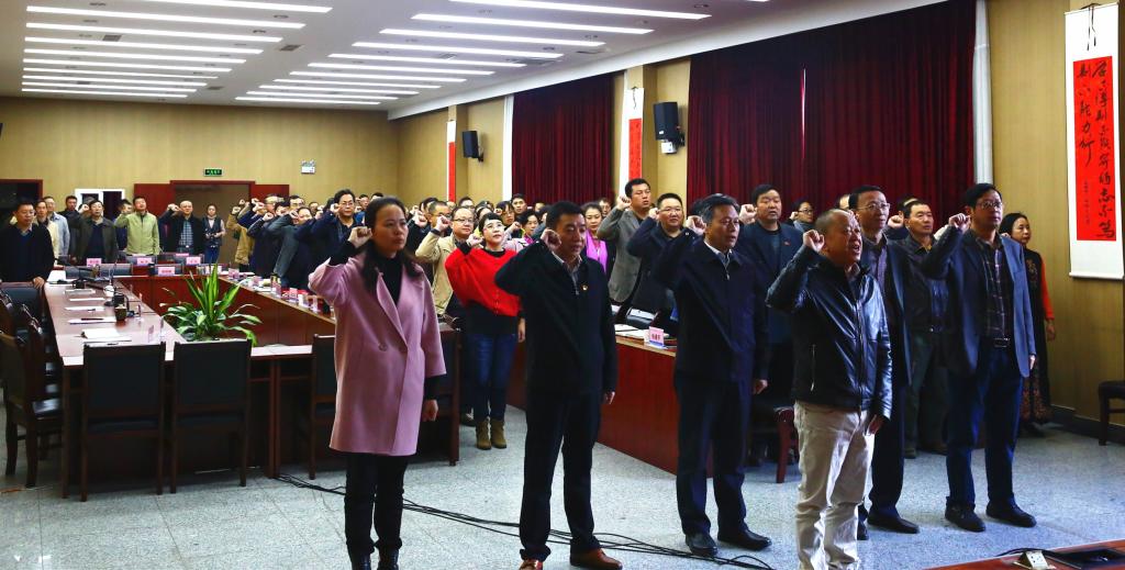 会议伊始,肖立军领誓,与会人员面对党旗,庄严宣誓,共同重温了入党誓词。