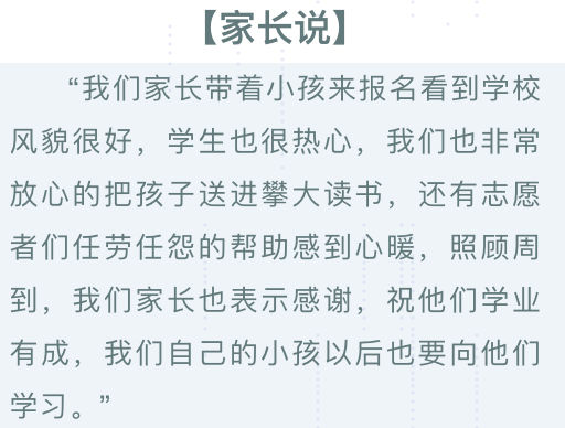 学校在迎新主干道,统一制作迎新展板横幅标语彰显学校的文化底蕴;简便报到流程展现迎新工作的新变化和新发展;夜晚体贴周到的志愿服务体现学校的人文关怀;主要工作区域的醒目标识标牌反映出迎新工作的细致周到;首次开通了迎新直播,全面展现学校迎新盛况,让没有到校的家长也能及时了解孩子到校情况;开展“我与家长在攀大的合影”“我与易班初印象”等形式多样的活动;学校领导、新生辅导员和老师暴雨和烈日下的坚守岗位展现了责任感和敬业精神。迎新过程中,涌现出了“荧光绿”“传媒蓝”“高级灰”等一大批勇于奉献、敢于吃苦的志愿者。无论在最前线的火车站,还是在最后方的宿舍和食堂,他们的身影无处不在,困了,趴一会儿,热了,歇一会,下雨了,索性脱掉雨衣,暴晒了,索性直奔烈日下,他们24小时不间断工作,他们奔跑在每一个需要他们的战场。他们用最真实的行动、最朴实的话语展示了攀大人的明德砺志、博学笃行的学术精神和体恤入微的人文关怀。真可谓:桃花潭水深千尺,不及我的迎新情。