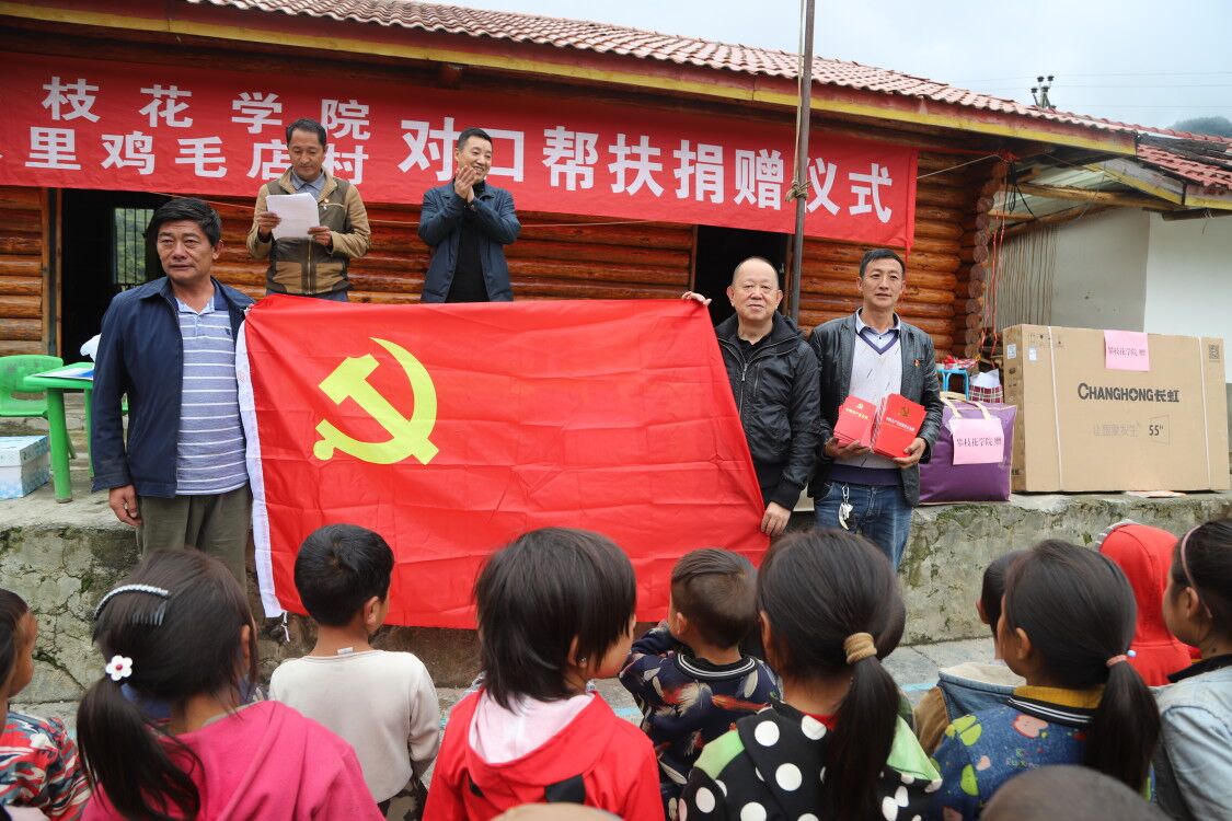 肖立军、胥刚代表学校向鸡毛店村委会赠送电脑和打印机;向村支部赠送党旗、党章和新修订中国共产党纪律处分条例;向村幼教点赠送电视、投影仪等教具;向五保户老人赠送棉被。