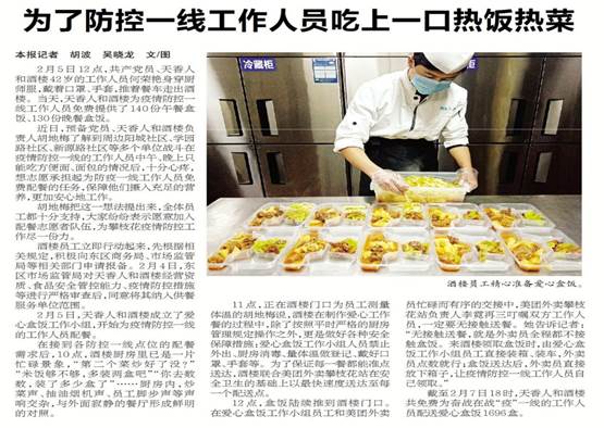 最可口的饭菜。全民战“疫”,企业有责。经济与管理学院1995级会计电算化专业胡地梅校友,作为我市餐饮企业天香人和酒店的总经理,带领公司员工坚持为防疫一线人员免费送餐。她说:“防疫控疫援疫,不仅是国家的事,更是全国人民的事,我们要做一些力所能及的事情,给防疫一线的工作人员做些可口的饭菜,让他们能够安心、暖心、舒心。”