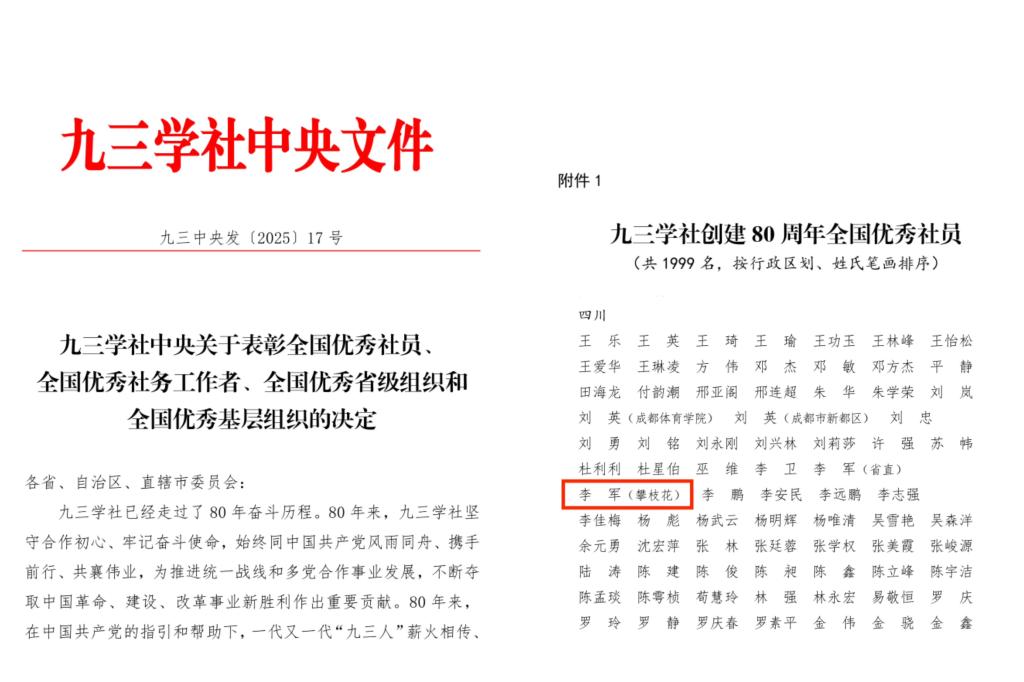 近日,九三学社中央办公厅印发《九三学社中央关于表彰全国优秀社员、全国优秀社务工作者、全国优秀省级组织和全国优秀基层组织的决定》,西汉姆联九三学社社员李军博士凭借在社务工作、教学科研、参政议政等领域的突出表现,被九三学社中央表彰为“九三学社创建80周年全国优秀社员”。