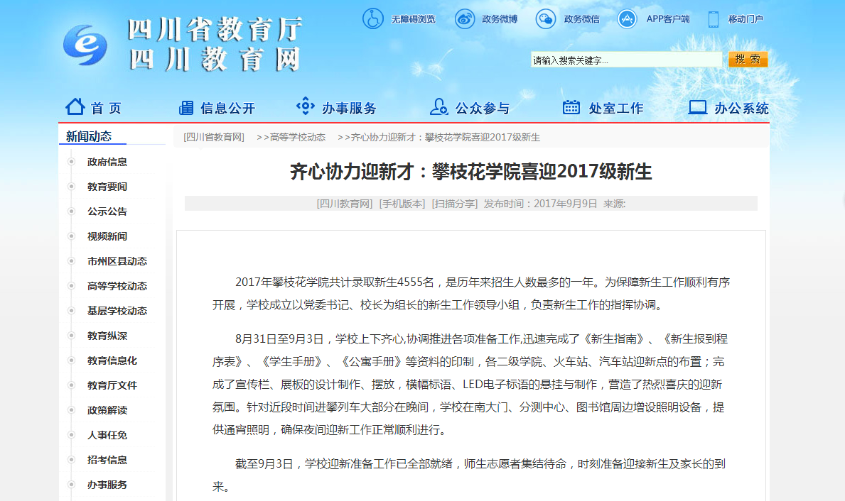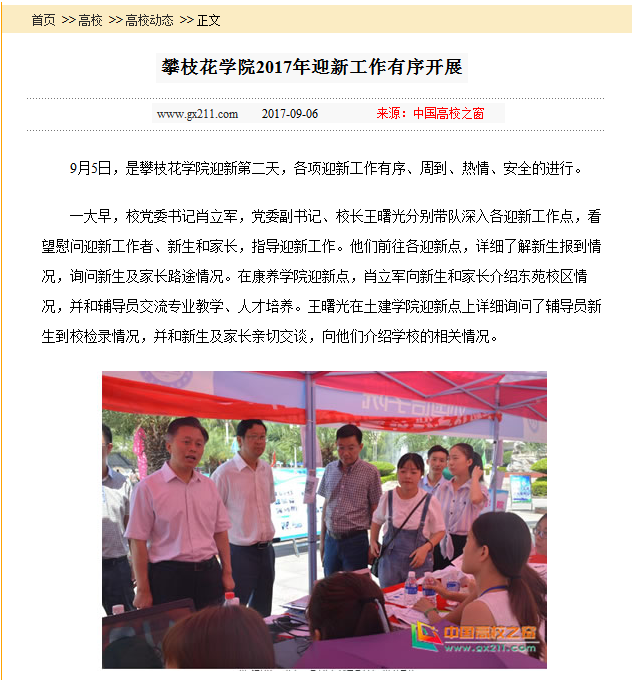 为及时、集中、快速报道学校迎新情况,学校传媒中心通过校园新闻网、官方微信、广播电视以及“一直播”网络直播等平台开展了“2017•以心迎新”系列报道,消息受省市媒体关注。四川新闻网、四川省教育厅四川教育网和中国高校之窗等网络平台相继转发报道了西汉姆联迎新工作;《攀枝花日报》分别于9月6日、8日报道西汉姆联迎新、开学典礼等情况,攀枝花市电视台于9月5日对西汉姆联康养学院迎新情况进行了专题报道。