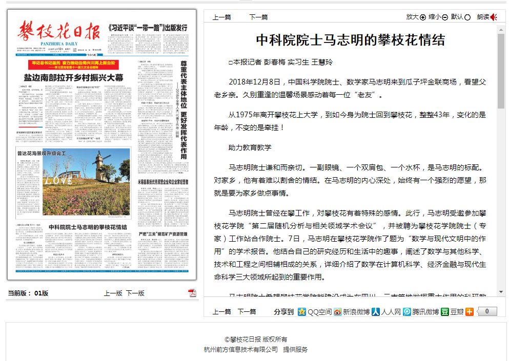 12月12日,《攀枝花日报》以“中科院院士马志明的攀枝花情结”为题专题报道,文章详细内容见: