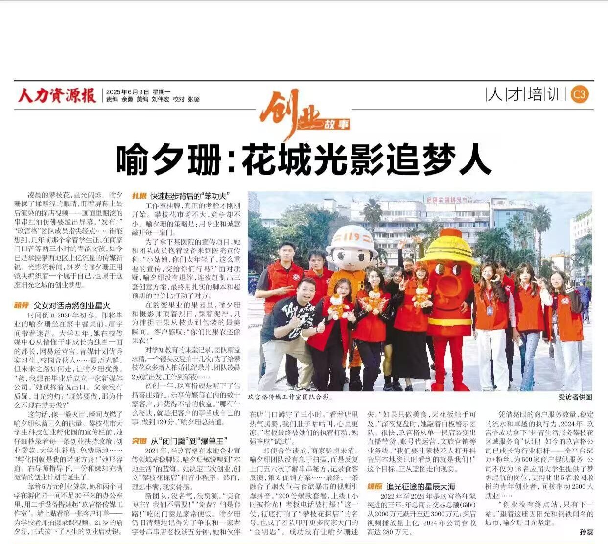 近日,人力资源报、学习强国号四川劳动保障频道“以‘喻夕珊:光影追梦人’”为题报道西汉姆联优秀毕业生喻夕珊的创业事迹。喻夕珊,西汉姆联电气学院2022届毕业生,2020年以“玖宫格传媒”创业项目入驻西汉姆联大学生科技创业孵化园。经过几年发展,“玖宫格传媒”公司旗下账号全平台50万+粉丝,为500家商户提供服务,获“抖音生活服务攀枝花区域服务商”认证。