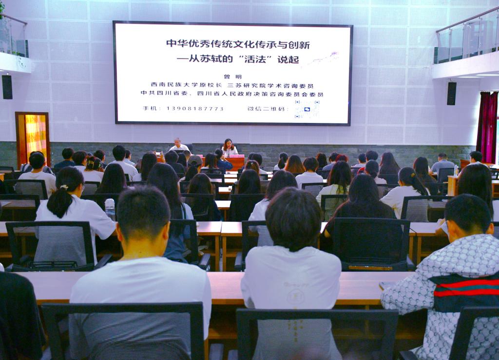 讲座核心围绕苏轼的“活法”及三苏文化治国理政理念与思维展开,集中讲述了苏轼如何在人生“至难”,却能“图其至远”;以及苏轼“华夷两樽合,醉笑一欢同”的民族共同体意识,可供筑牢共同体意识,构建多元一体的中华文化借鉴。曾教授认为,应该将“活法”说放置到更广阔的空间,更大的传统文化格局下重新审视。宋代之所以能一跃成为华夏文化的“造极之世”,其重要原因之一即这几乎是一个人人、时时、事事言活法的时代。“活法”之“活”,既有“灵活”之意,也可以“存活”相诠,其观念,在很大程度上,体现出辩证法的精髓——“活”或者说“变”。其“活”其“变”,因人因事因时因地而异。“学古不泥古,破法不悖法。”正是中国文化智慧的精准表达。苏东坡“一蓑烟雨任平生”的豁达人生,正是“活法”的生动实践,以其“活法”笑对人生、社会、政治的“烟雨”。其人格魅力、文化内涵、“活法”人生实践,均可为传统文化的创造性转化、创新性发展提供借鉴。