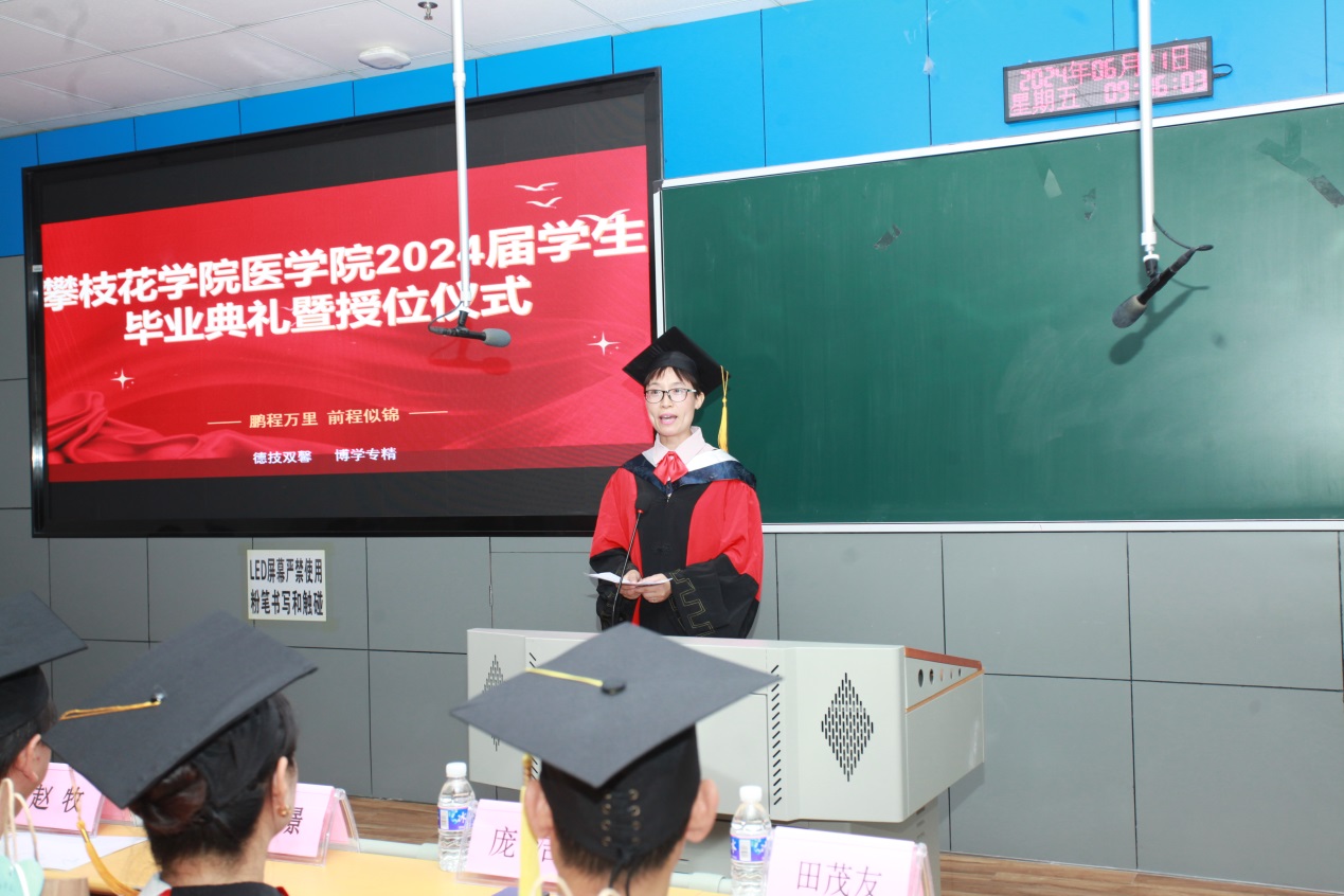 典礼上,教师代表李汇明寄语毕业生,要谨记校训“明德砺志博学笃行”以及医学院“德技双馨博学专精”的理念,结合实践,自我学习,以更加扎实的专业能力造福社会。