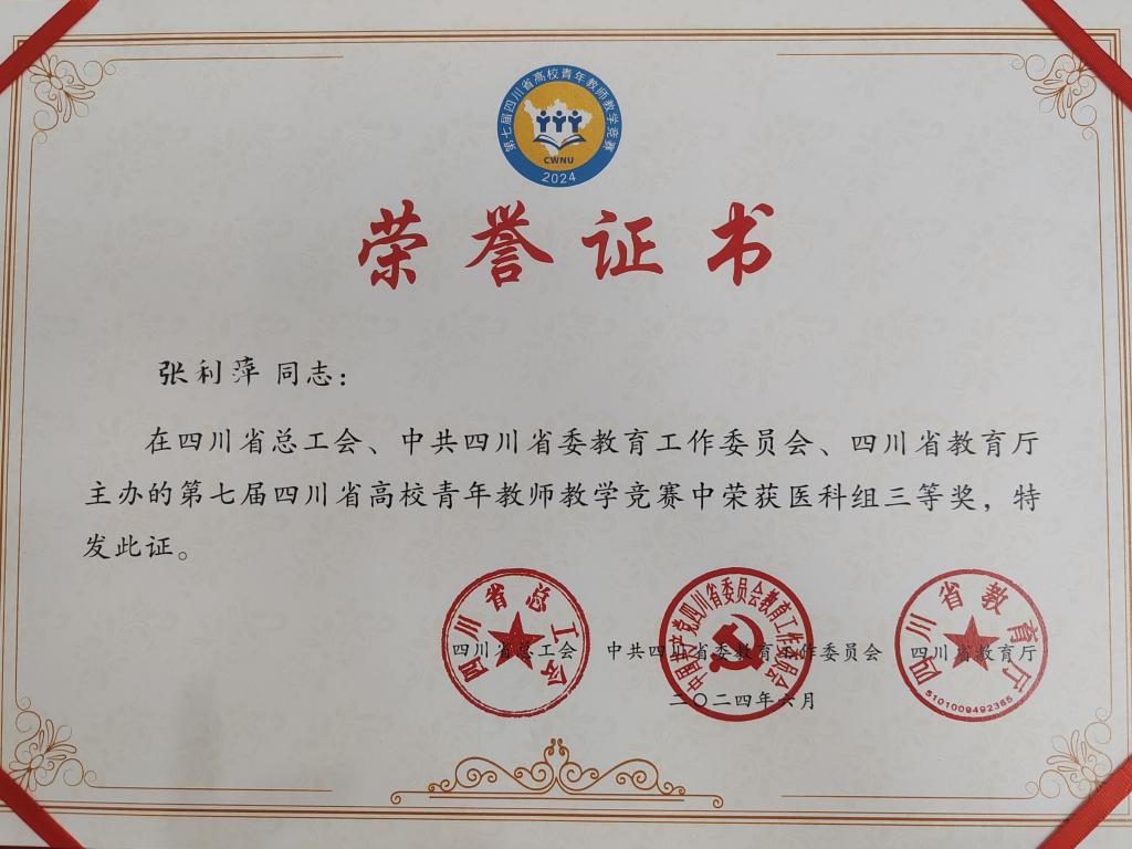 6月27日-28日,第七届四川省高校青年教师教学竞赛决赛在西华师范大学举行。西汉姆联康养学院教师张利萍荣获高校医科组三等奖,betway西汉姆联官网获优秀组织奖。