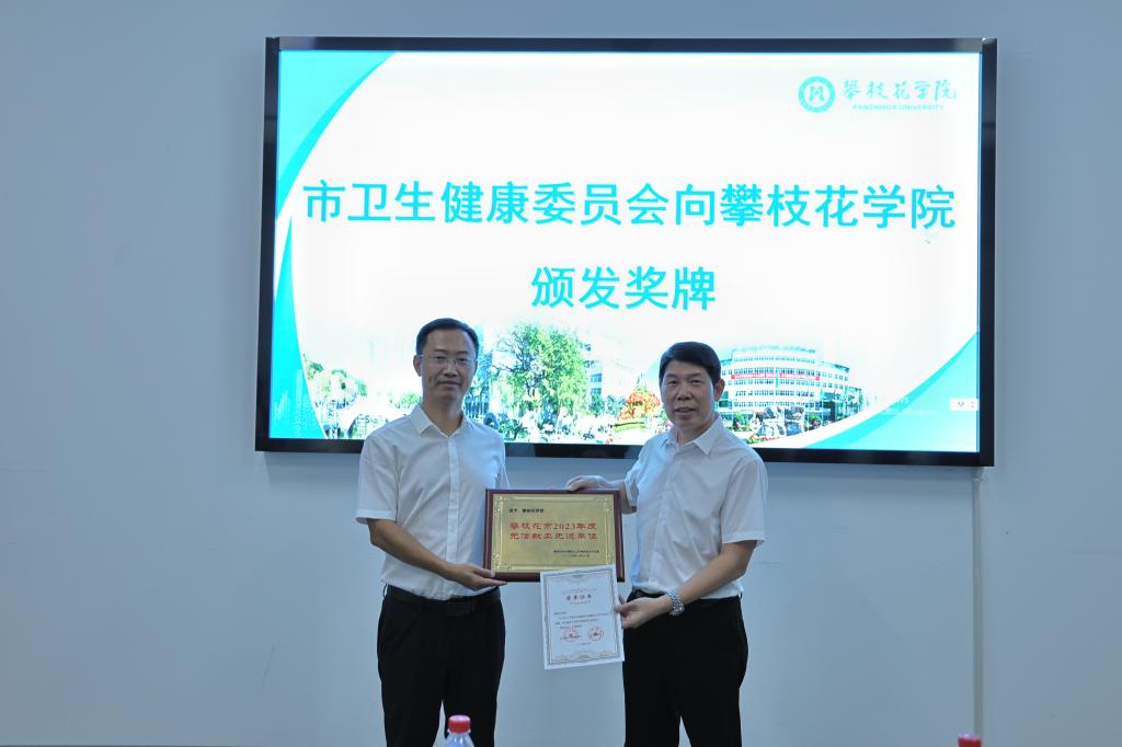 朱定荣代表市中心血站报告高校无偿献血工作情况,感谢长期积极配合参与献血,为保障攀枝花人民群众身体健康发挥了重要作用,彰显了学校的社会担当和新时代青年的无私奉献精神。