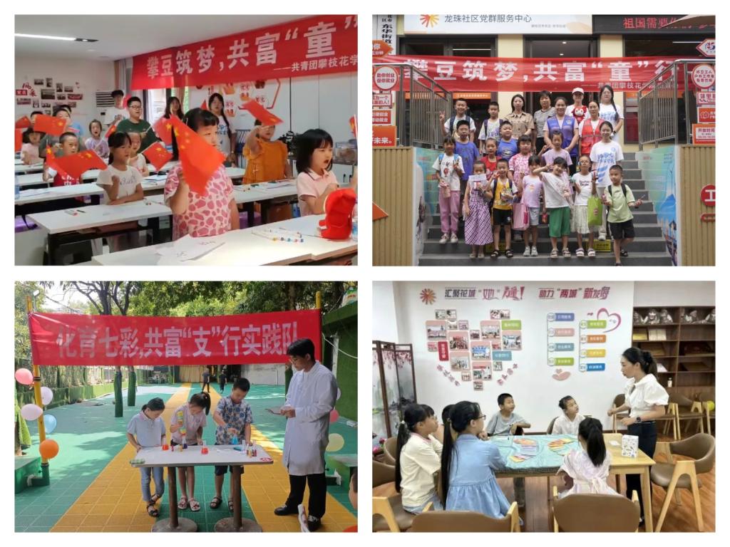 校团委“攀豆筑梦 共富‘童’行”实践团在龙珠社区和攀枝花村开展了为期10天的支教活动,剪纸、插花手工课堂、古法健身操、声乐课堂……丰富多彩的教学内容,让孩子们在欢快的气氛中了解了中国传统文化。生物与化学工程学院“化育七彩,共富‘支’行”实践队打造以“生物化学启蒙”为主线的红色课堂、文化课堂、民族课堂、实践课堂,涵盖思想引领、化学科普实验、太极拳教习+展演、体验非遗扎染等20余节内涵丰富的课堂。外国语学院与米易县妇联共同开展暑期支教活动,“攀峰共富七彩队”围绕七彩主题教育和英语教学等,在留守儿童的心中传承红色基因、培养良好品格、形成正确价值观,并提升孩子们的法律意识。
