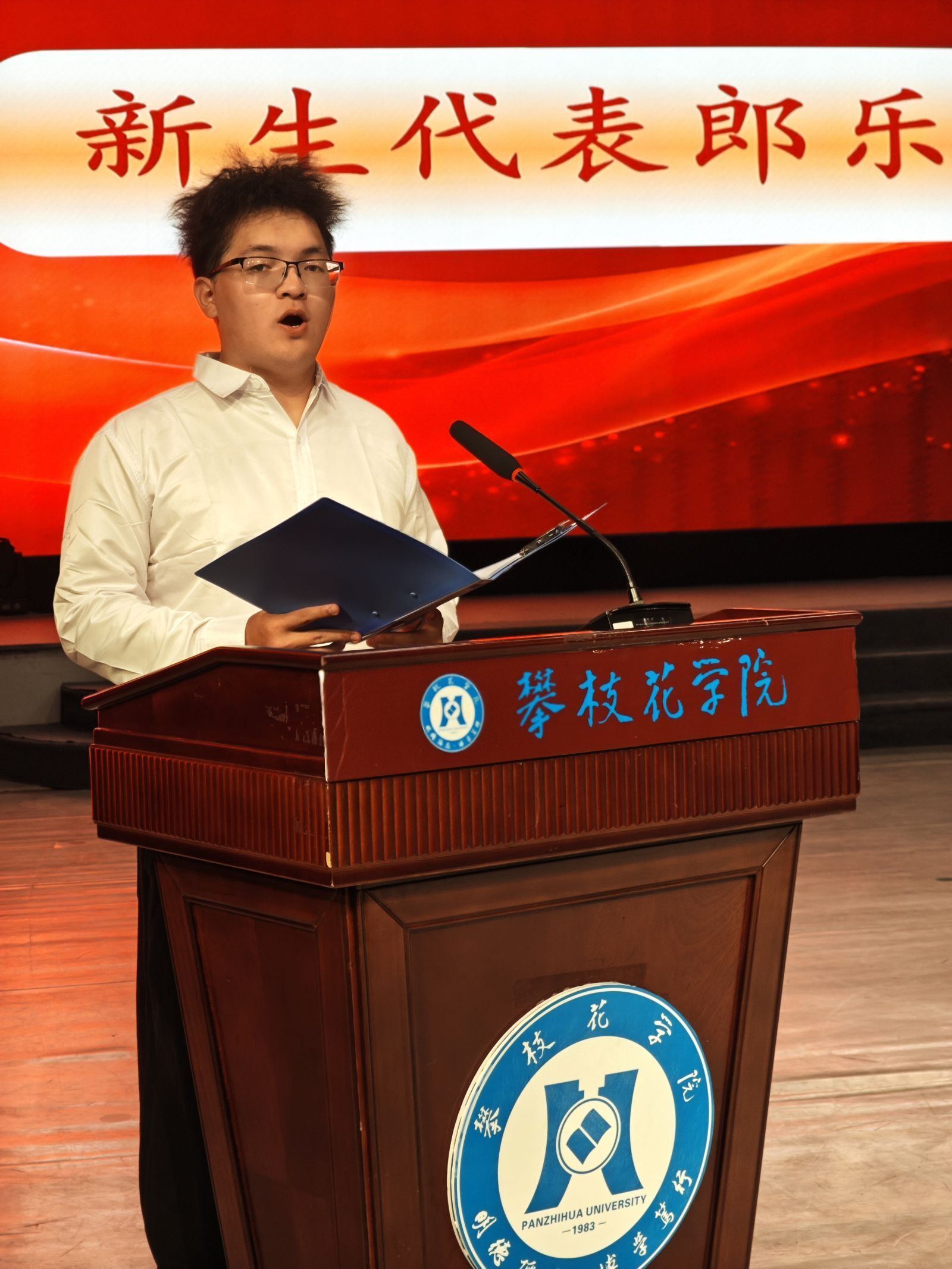 本科新生代表郎乐同学发表感言。他代表全体新生表达了对大学生活的期待与憧憬,并表示将秉承学院精神,勤奋学习,积极进取,努力成为有理想、有本领、有担当的新时代青年。