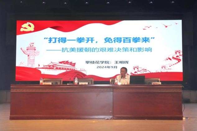 数计学院党委书记王明辉以《“打得一拳开,免得百拳来”---抗美援朝的艰难决策和影响》为题,从抗美援朝的艰难决策、战场上的较量、抗美援朝的历史影响三个方面展开阐述。希望同学铭记历史,向先辈学习,凝聚力量,砥砺前行。