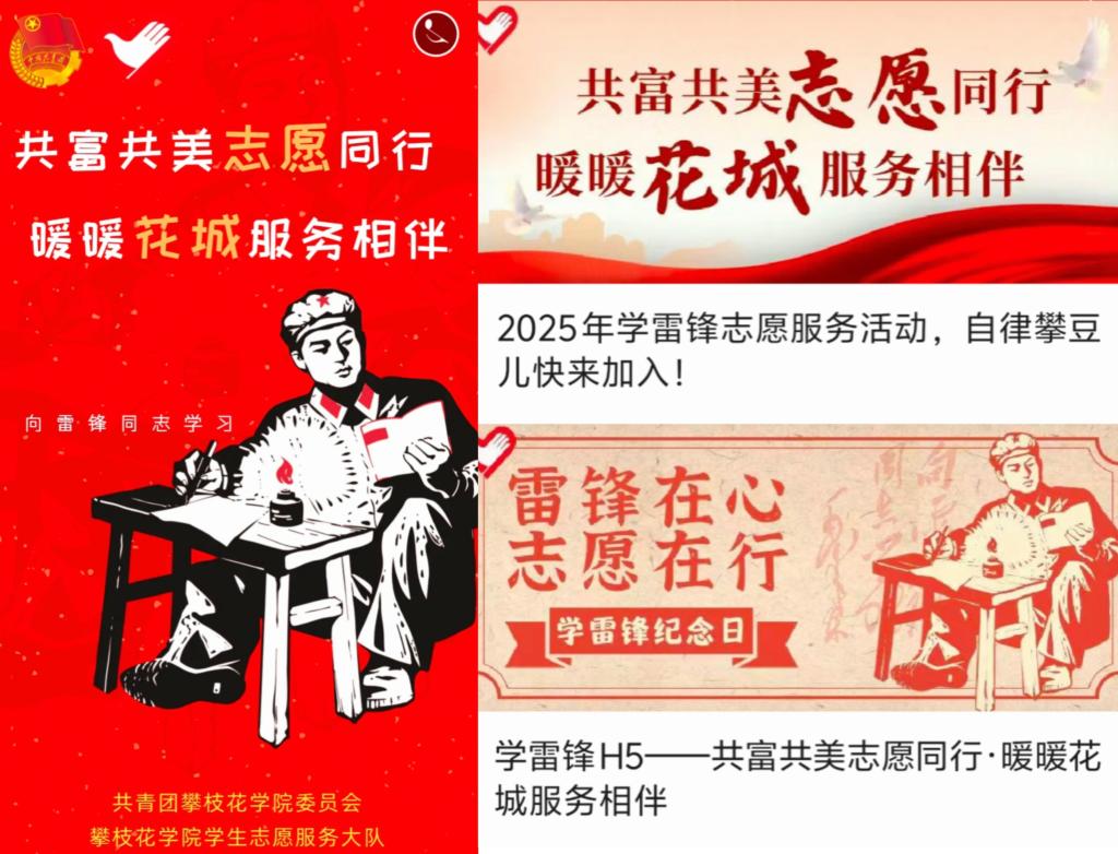 学生志愿服务大队依托“青春攀大”官方平台发布《学雷锋—共富共美志愿同行·暖暖花城服务相伴》主题H5,集中呈现校园文明督导、返家乡实践、光盘行动等志愿服务成果,形成线上线下融合传播效应,营造“人人学雷锋、处处见行动”的校园风尚,引导攀豆儿们将雷锋精神内化于心、外化于行,主动成为新时代雷锋精神的诠释者、发扬者和笃行者。