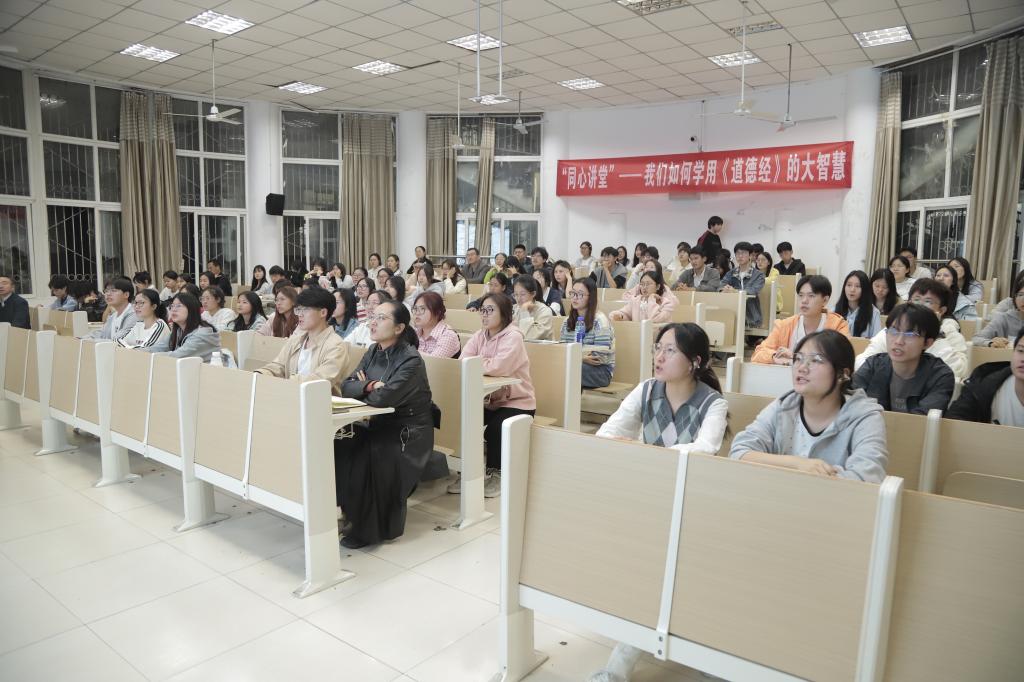 黄老师精选《道德经》八十一章的十一章,以诵读经典开篇,在介绍老子及《道德经》的历史渊源、深远影响之后,选取部分章节重点讲解。讲到“天人合一”,黄老师请同学们畅谈自己的理解,现场互动气氛活跃;讲到“阴阳冲和”,告诉同学们要树立辩证思维,以对立统一规律看待事物;讲到“五修天下”,又与儒家“修齐治平”(修身齐家治国平天下)进行对比讲解,阐明如何汲取《道德经》的智慧推动个人、家庭、社会、国家和世界的和谐发展,与社会主义核心价值观一脉相承。