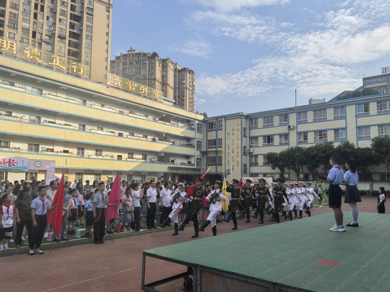 退役军人负责训练的国旗护卫队受邀至攀枝花市第九小学举行升旗仪式。队员们身着整齐制服,步伐铿锵,护送国旗至升旗台。在庄严的国歌声中,全体师生整齐列队,少先队员行礼注目,五星红旗冉冉升起。这一刻,春风拂起飘扬的国旗,吹动孩子们胸前的红领巾,内心的爱国情怀也随之激荡。