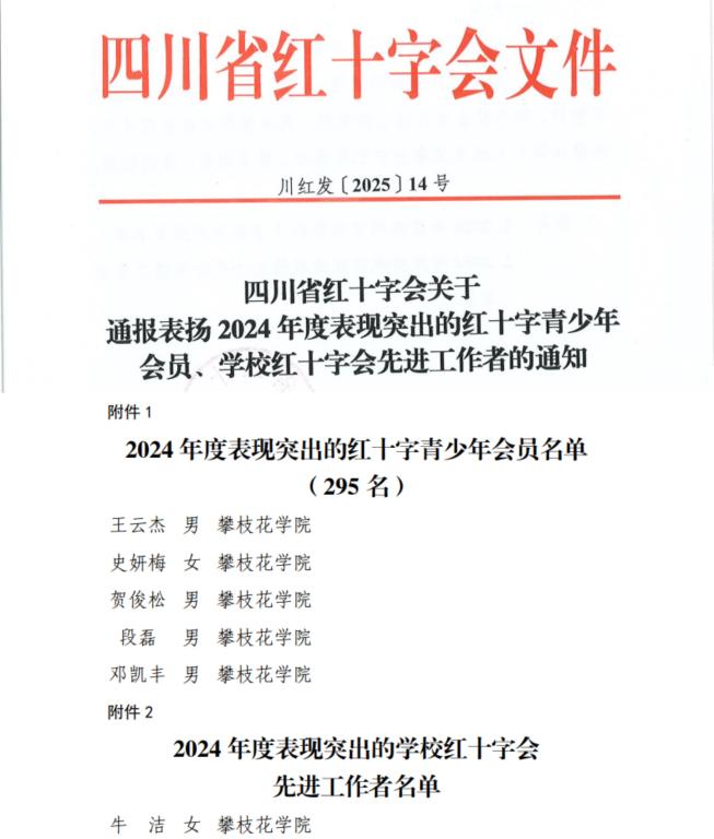 近日,四川省红十字会发布了《关于通报表扬2024年度表现突出的红十字青少年会员、学校红十字会先进工作者的通知》,西汉姆联基础医学院学子王云杰、史妍梅、贺俊松、段磊、邓凯丰五位同学荣获优秀红十字青少年会员,基础医学院教师牛洁荣获红十字会先进工作者。