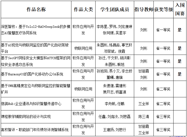 此次获奖作品涵盖优化算法、网络安全大模型、国产化软件开发、物联网技术应用等领域,由数计学院刘彬、甘丽霞、兰全祥、陈三清等教师组成的导师团队指导,通过“项目驱动+产学研结合”的模式,将企业真实需求融入学生实践,使学生能够在学科竞赛中锤炼核心技术能力。