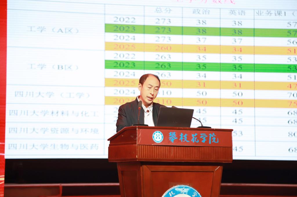 院长朱学军对本次表彰大会进行了总结。他首先对101名上岸学子表示祝贺,他表示,学院考研上岸录取率达33.55%再创新高,这不仅仅是数字的突破,更是对学院教学质量的肯定。他寄语上岸学子,上岸不是终点,而是研究新的起点,大家要努力深耕,以“学"赋能自身发展。同时,他为22级、23级备考学子分析近几年理工科、农科考研国家分数线,考研报考人数、院校分数线,激励学子向上岸优秀学长学姐学习,抓住考研机遇,专心备考。他表示,学院将继续为考研学子营造良好氛围,以考研促高质量就业,为学校建设一流大学贡献力量。
