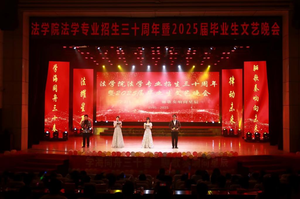 6月8日晚,在阳光会堂举办了法学院法学专业招生三十周年暨2025届毕业生文艺晚会。学校党委常委、副校长朱云生,学工部、校团委等部门负责人,法学院领导班子、校友会成员及 2025 届毕业生欢聚一堂,共同回溯法学专业三十年育人华章,见证毕业生怀揣理想,奔赴远方。晚会伊始,法学院党委书记张琳致辞,向全体师生为学院发展倾注的心血致以诚挚谢意,对校友们回馈母校的拳拳之心与倾力相助表示衷心感激,同时也对家长们长久以来的信任与支持表达了深深的感谢,并深入阐述了法学院近期在学科建设、人才培养、科研创新等领域斩获的成果,擘画了学院砥砺奋进、再攀高峰的宏伟蓝图。伴随着一曲激昂的《永远的紫荆花》奏响,晚会拉开序幕。晚会分为序章、正章与尾章,各环节精彩纷呈,层层递进。序章中,歌曲《逆光》以励志歌词致敬毕业生们在逆境中成长的坚韧;古典舞《彩云追月》以优美舞姿勾勒出诗意盎然的校园画卷,唤起众人对校园生活的美好回忆。正章里,《同桌的你》旋律响起,瞬间引发全场情感共鸣,将大家带回同窗共读的岁月;《新韵华裳》以独特的表演形式传递文化自信,展现中华文化的博大精深;《Loco》激情四溢的舞步更是燃爆全场,将气氛推向高潮。尾章中,毕业生们合唱的《彩虹》饱含深情,2025 届毕业生将带着母校的殷切祝福与谆谆嘱托,扬帆起航,书写属于自己的璀璨篇章。