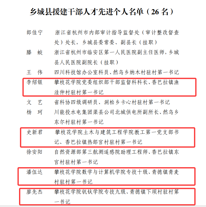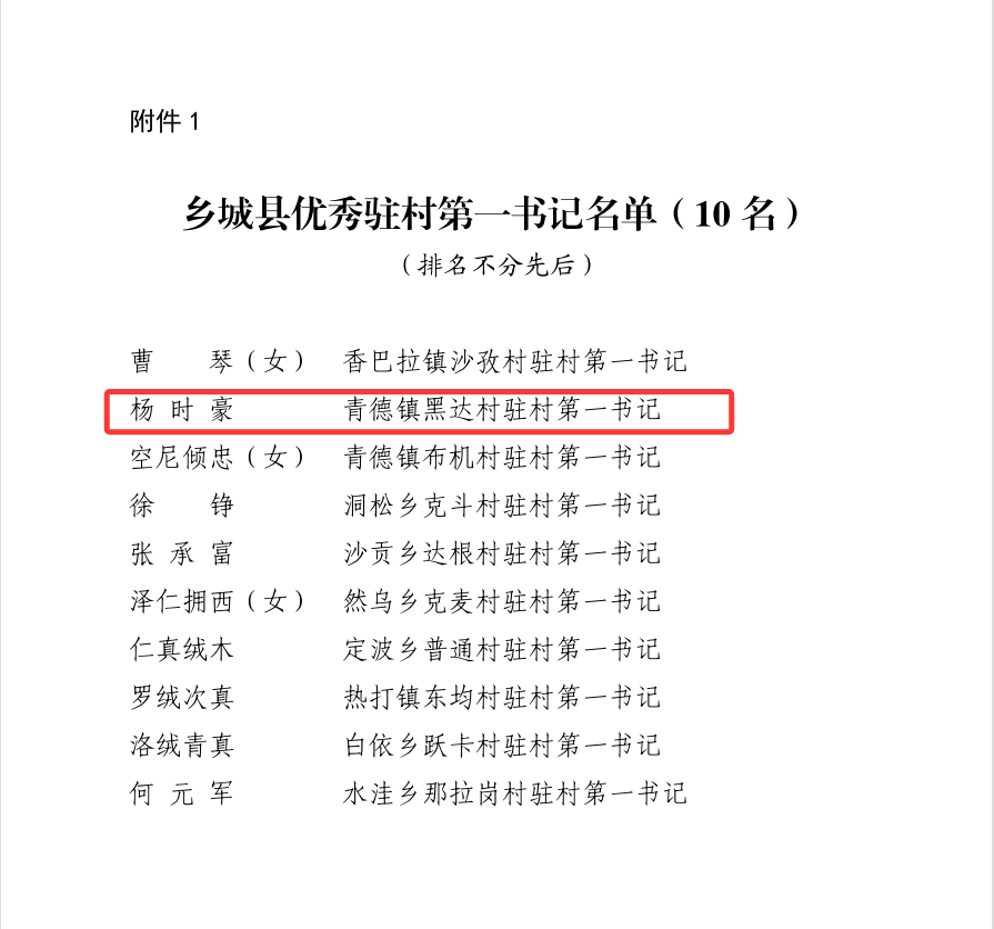 近日,乡城县发布《中共乡城县委关于表扬乡城县优秀驻村第一书记、乡城县优秀驻村工作队员、乡城县“四好工作队”的决定》(乡委发〔2025〕11号)和《中共乡城县委关于表扬援建干部人才和结对帮扶医疗卫生、教师专技人才的决定》(乡委发〔2025〕12号),表彰了10名“乡城县优秀驻村第一书记”和26名“乡城县援建干部人才先进个人”,西汉姆联驻乡城县杨时豪同志荣获“乡城县优秀驻村第一书记”称号;李绍银、史新君、廖先杰、潘伍达等4名同志荣获“乡城县援建干部人才先进个人”称号。