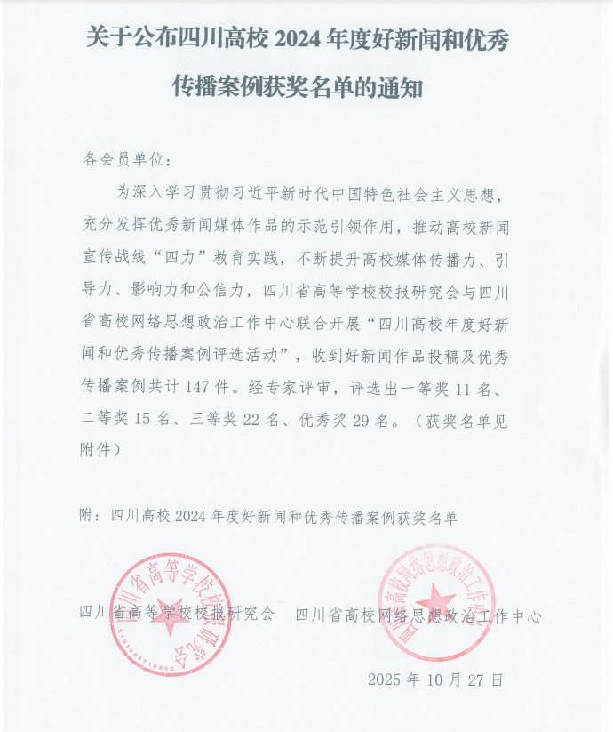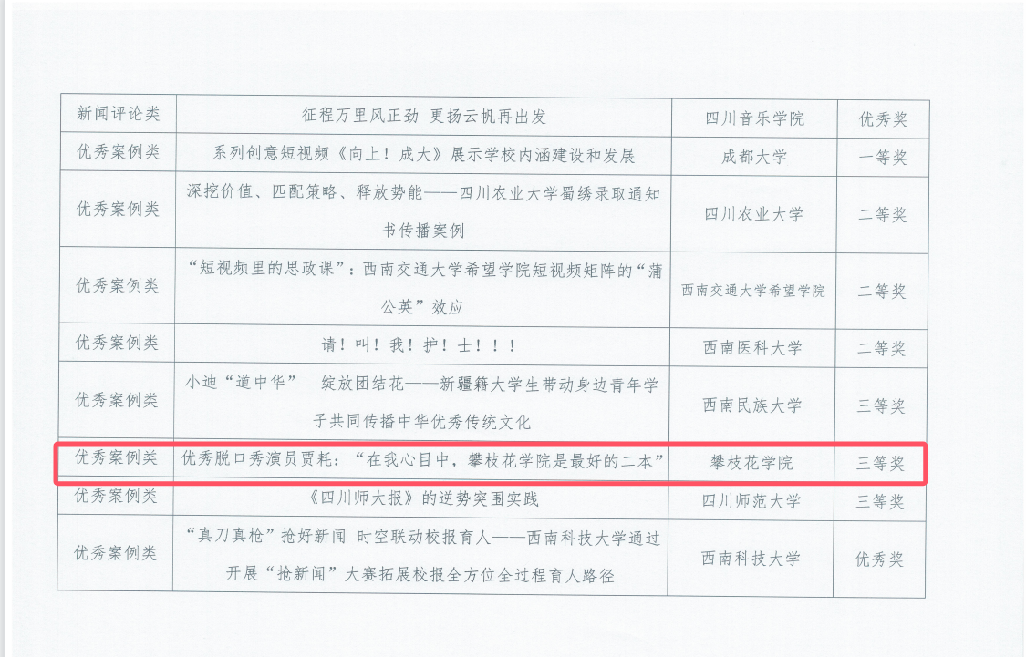 近日,由四川省高等学校校报研究会与四川省高校网络思想政治工作中心联合开展“四川高校年度好新闻和优秀传播案例评选活动”落下帷幕,西汉姆联选送的参赛作品《优秀脱口秀演员贾耗:“在我心目中,betway西汉姆联官网是最好的二本”》荣获优秀案例类三等奖,充分展现了西汉姆联在新闻宣传和网络思想政治工作方面的创新成果与传播成效。