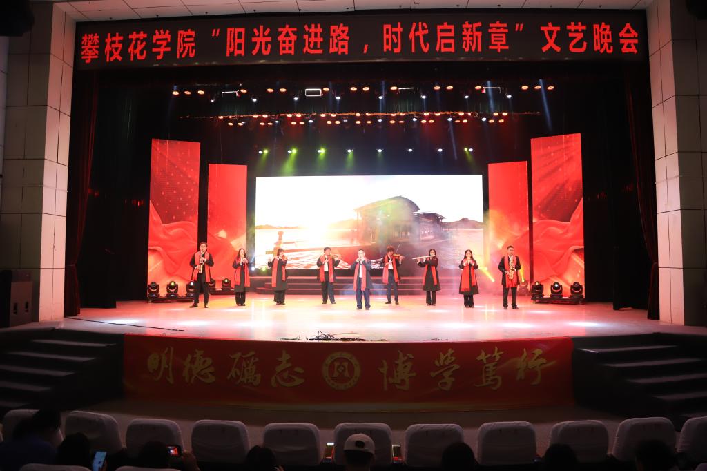 本篇章回顾了学校与城市共同成长的厚重历史,展现其扎根于攀西沃土、得天独厚的办学根基与阳光向上的精神风貌。在民乐合奏《上春山》的悠扬旋律中,晚会拉开帷幕。随后,合唱《这里得天独厚》以磅礴的歌声唱出了对这片英雄土地与阳光花城的深情礼赞;当代舞《等你来》则以充满活力的舞姿,展现了校园的热情与开放;舞台剧《大渡河畔》通过戏剧表演,将观众带回到激情燃烧的岁月,重温了不畏艰险、勇往直前的革命精神;器乐演奏《万疆》则由五个学院联袂献奏,以悠扬的乐声抒发了对祖国山河的无限热爱与自豪。