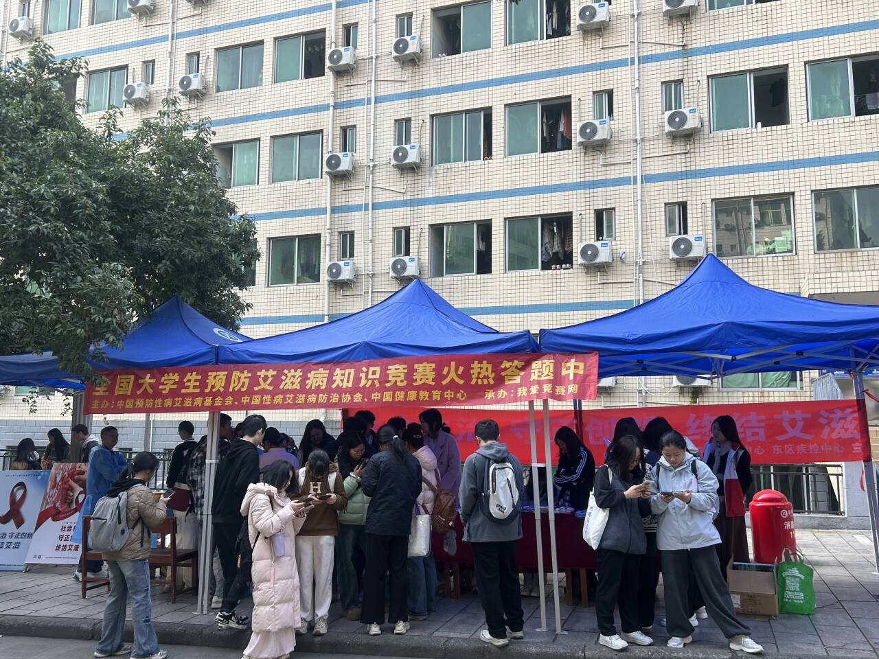 12月1日至2日,东华山校区和公园校区学生社区同步启动现场宣传活动。活动现场设置主题签名墙、防艾科普展板,志愿者累计发放宣传资料1000余份,通过防艾知识问答、红丝带手工制作等互动形式,让科学防艾理念在趣味参与中扎根人心。市、区疾控中心专业人员现场提供免费保密检测与一对一咨询服务,近500名学生主动参与咨询检测,主动筑牢自我防护屏障。