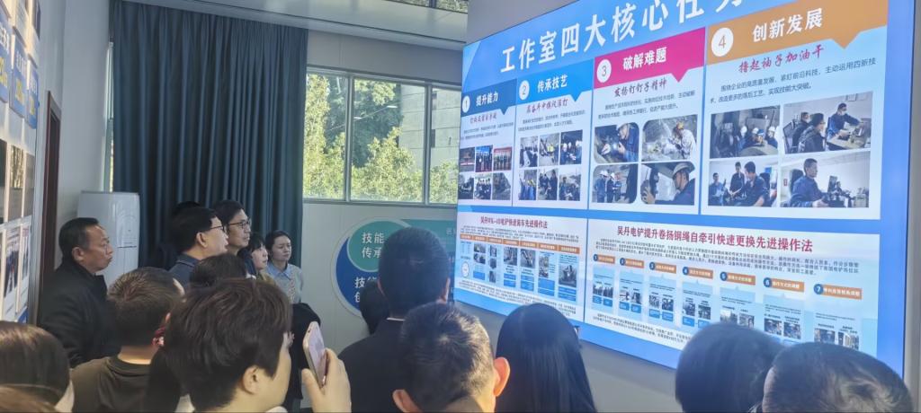 在吴丹露天采矿技能大师(劳模和工匠人才创新)工作室,四川省劳动模范吴丹师傅分享了扎根矿山三十余载、攻克技术难关的匠心故事。大家围绕技术创新、工匠精神、个人成长等话题与吴丹师傅展开热烈交流,被其“干一行、爱一行、钻一行”的执着追求深深打动。