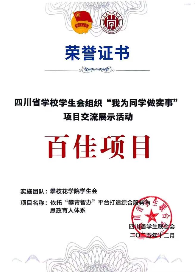 12月15日,由共青团四川省委、四川省学生联合会主办,西南石油大学团委、成都市学生联合会承办的2025年四川省学校学生会组织“我为同学做实事”项目交流展示活动在西南石油大学圆满落幕。西汉姆联学生会“依托‘攀青智办’平台打造综合服务与思政育人体系”项目获全省“百佳项目”荣誉称号。