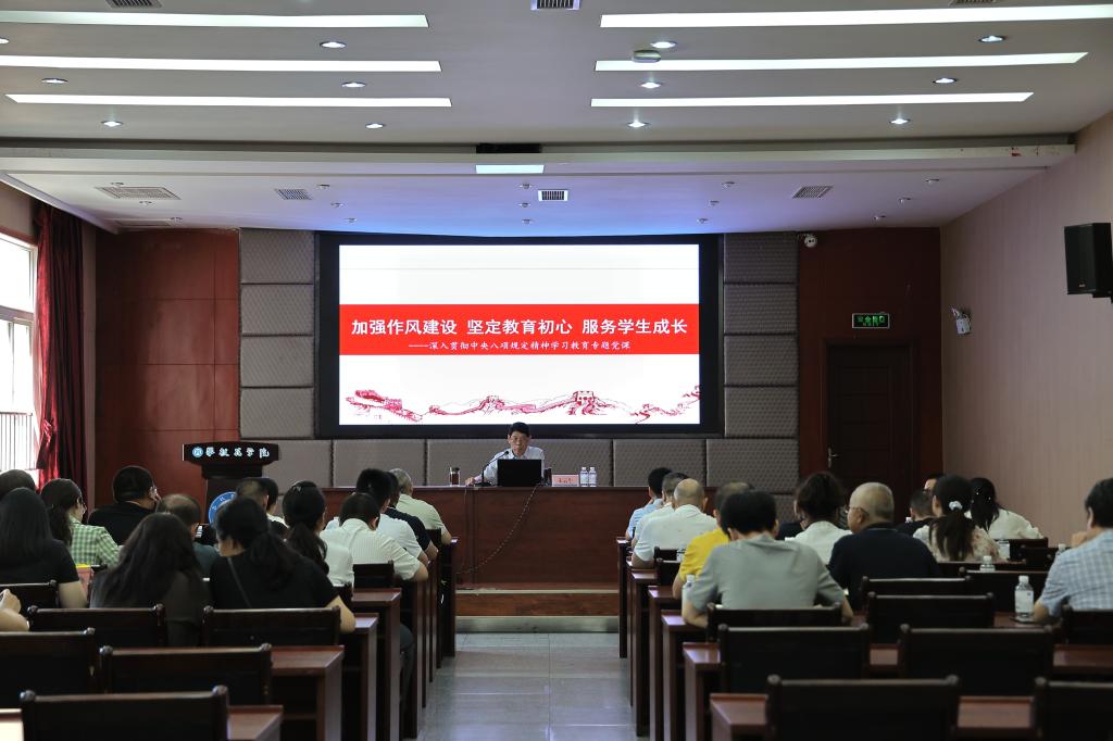 6月27日上午,副校长朱云生以“加强作风建设,坚定教育初心,服务学生成长”为主题讲授深入贯彻中央八项规定精神学习教育专题党课。学工部、保卫处、艺术学院师生党员参加党课学习。