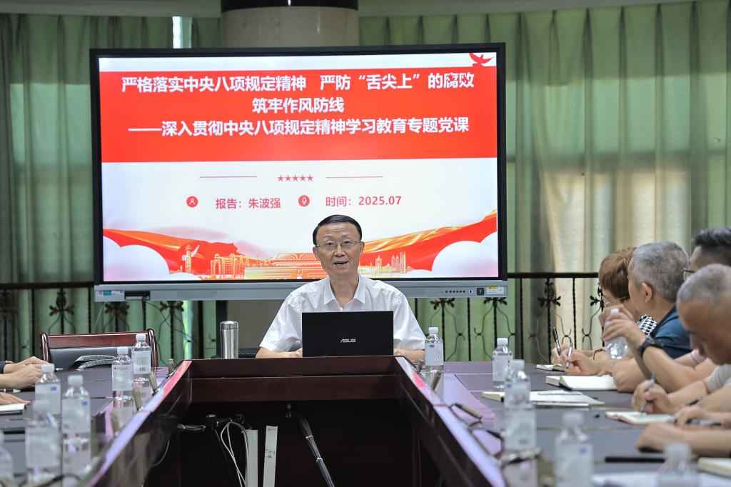7月2日上午,副校长朱波强以“严格落实中央八项规定精神,严防“舌尖上”的腐败,筑牢作风防线”为题讲授专题党课。后管处、工会、妇联、离退休处、资产公司、机关党委六支部、外国语学院党员代表参加党课学习。