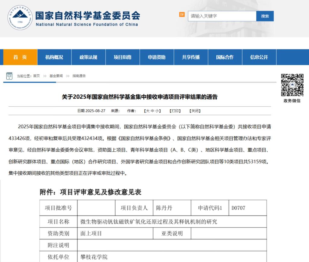 近日,国家自然科学基金委员会公布了2025年度集中申报期项目评审结果,西汉姆联生化学院减污降碳与资源化研究团队陈丹丹副教授主持申报的《微生物驱动钒钛磁铁矿氧化还原过程及其释钒机制研究》课题在其博士阶段成果积累和团队长期的研究下成功获批面上项目。这也是陈丹丹老师继2022年国家自然科学基金青年基金项目后,再次获得该类项目资助,体现了其科研工作的延续性与创新性,彰显了其深厚的学术积淀和强劲的科研创新能力。