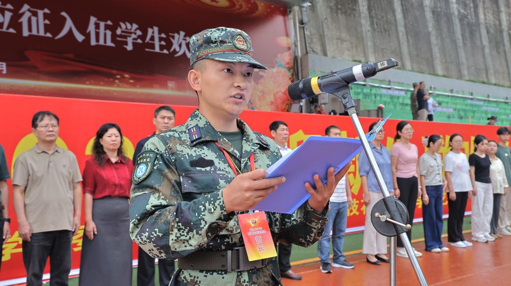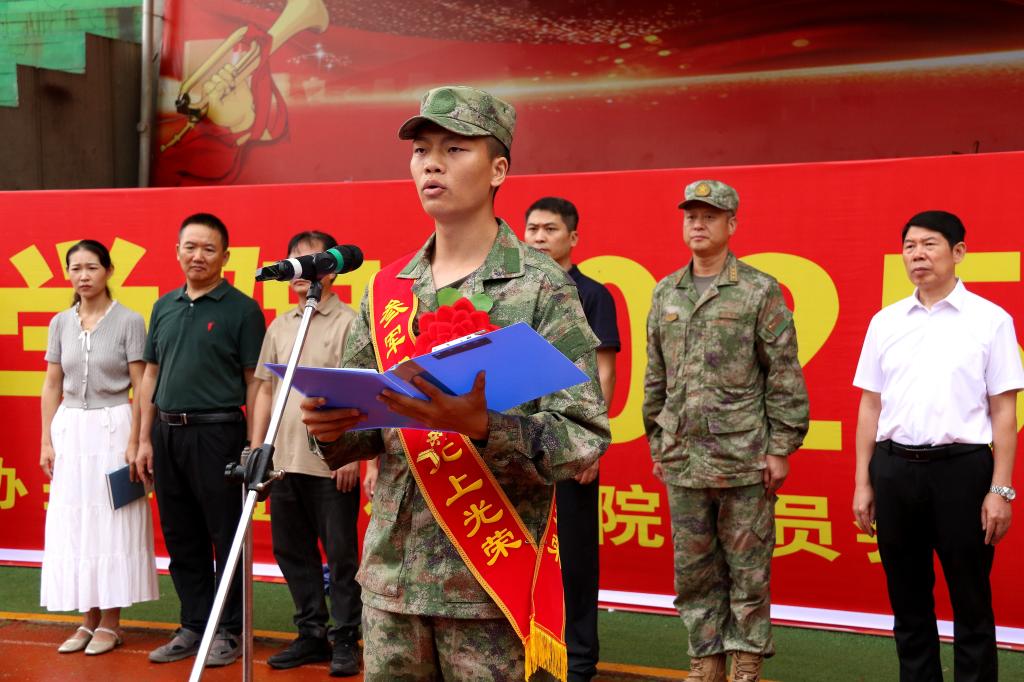 原国防教育协会学生干部、国旗护卫队副队长,经济与管理学院2021级国际经济与贸易专业学生杨思源作为入伍新兵代表发言,他表示,将牢记母校教诲,不负韶华、不辱使命,在军营中淬炼成钢,用青春和热血书写强军报国的壮丽篇章。