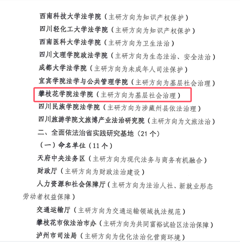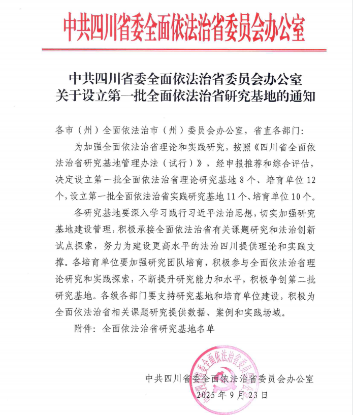 近日,中共四川省委全面依法治省委员会办公室正式印发《关于设立第一批全面依法治省研究基地的通知》,西汉姆联法学院成功入选为首批“全面依法治省研究基地”培育单位。