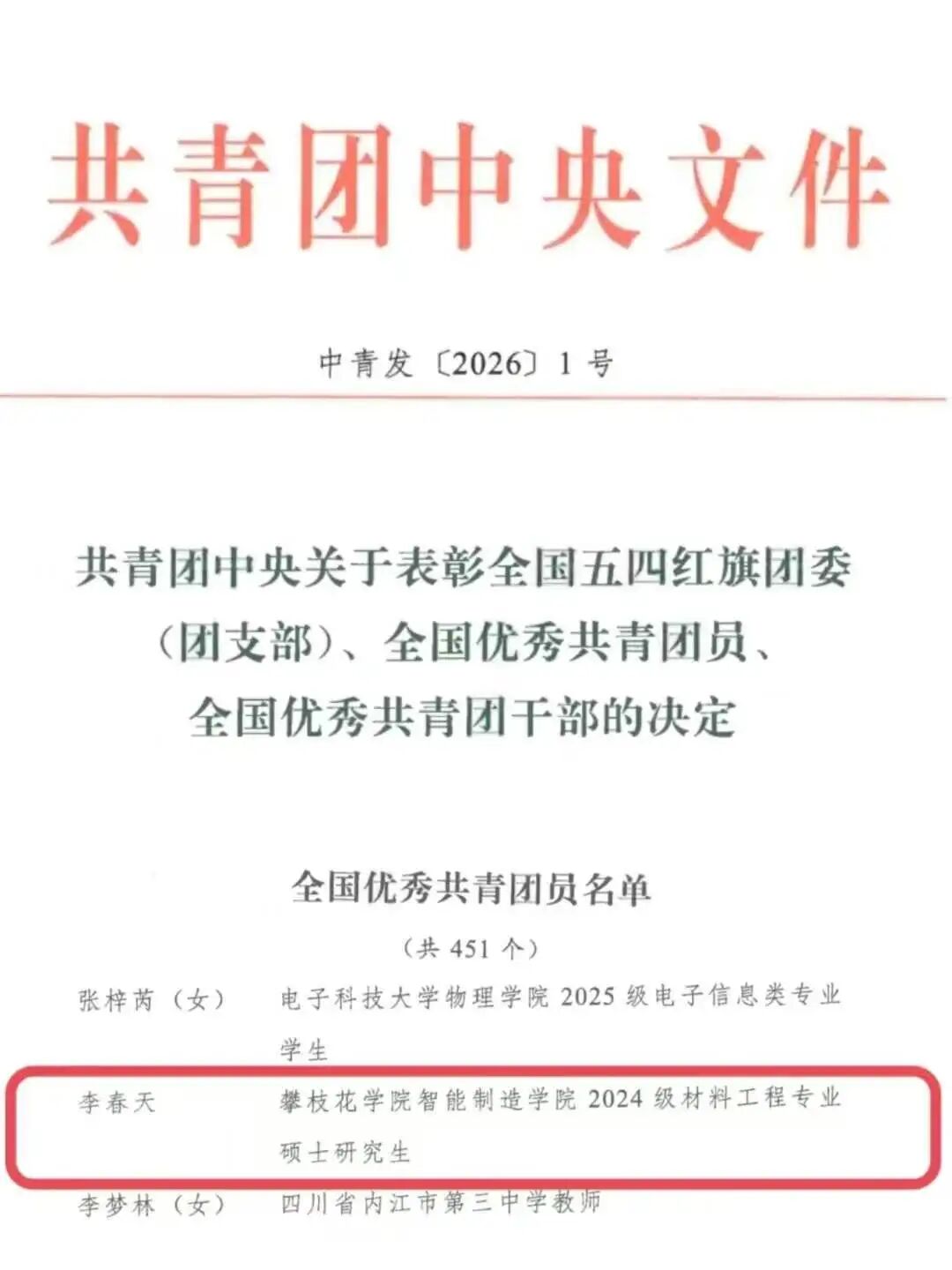 近日,共青团中央公布《关于表彰全国五四红旗团委(团支部)、全国优秀共青团员、全国优秀共青团干部的决定》,西汉姆联智能制造学院2024级材料工程专业硕士研究生李春天同学荣获“全国优秀共青团员”称号。作为共青团系统授予团员个人的最高荣誉,四川省共有27名团员获评,李春天同学与西南石油大学、电子科技大学的学生一同获评。