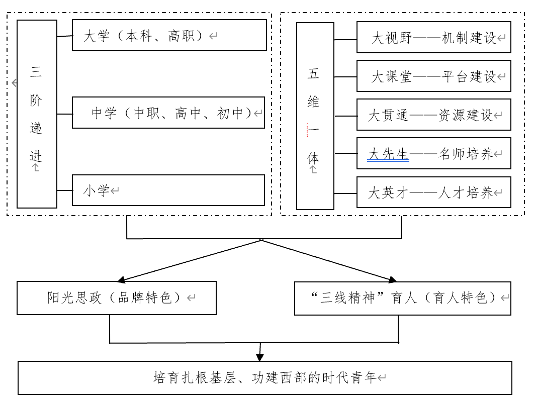 (二)纵向上,“三阶递进、五维一体”推动三线精神融入攀枝花市大中小学思政课一体化建设,通过“阳光思政”培育扎根基层、功建西部的时代青年。马克思主义学院以四川省大中小学思政课一体化建设为契机,紧密围绕立德树人根本使命,以“三线精神”为主要内容,以“阳光思政”为核心品牌,与攀枝花市教体局、高职、中职、高中、初中、小学等单位构建“三阶递进、五维一体”的大中小学思政课一体化育人格局。